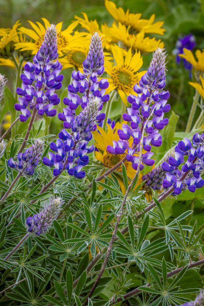 "USA, Oregon, Tom McCall Nature Conservancy. Balsamroot and lupine flowers close-up."
