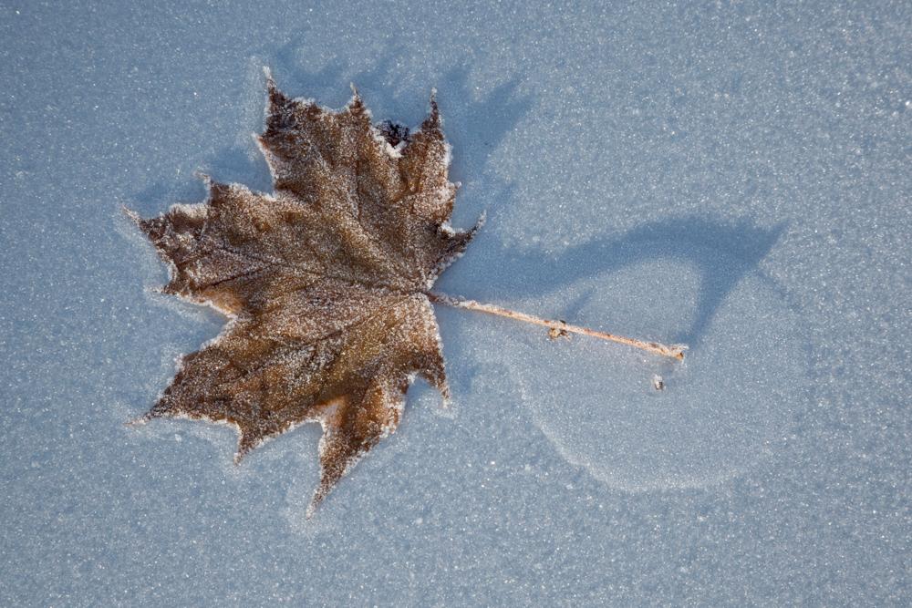 "Usa, Oregon, Keizer, maple leaf in frost on top of car."