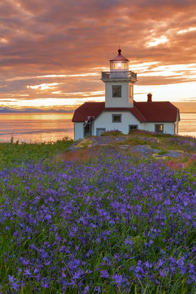 "USA, Washington State, San Juan Islands. Patos Lighthouse and camas flowers at sunset."