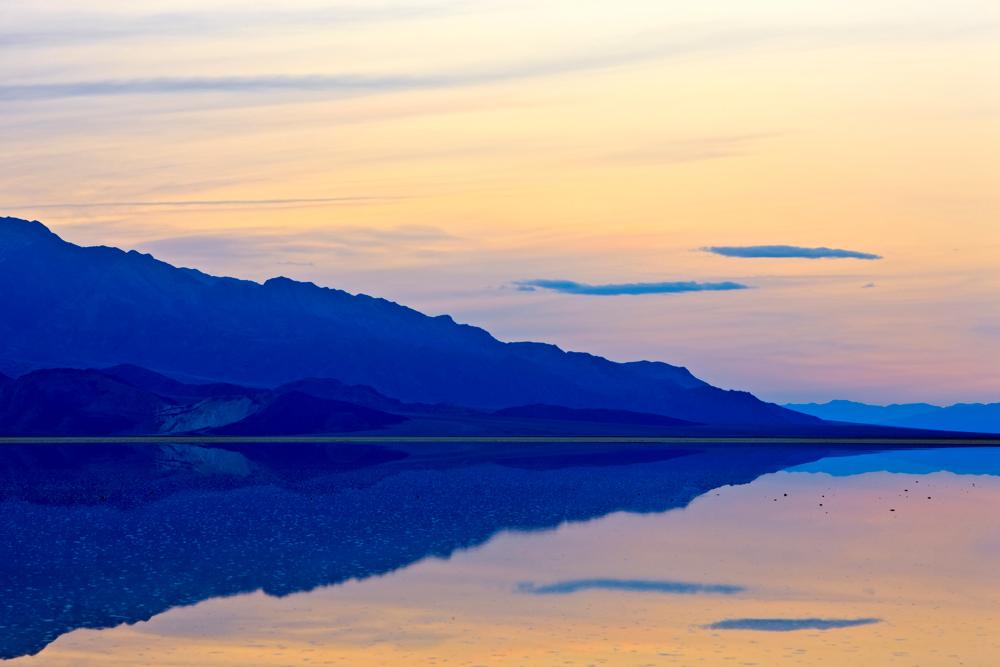 "USA, California, Death Valley, After heavy rain, water filled Badwater Basin, Death Valley National Park"