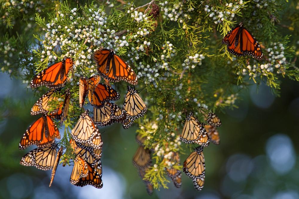 "Monarch butterflies (Danaus plexippus) roosting in Eastern Red Cedar tree (Juniperus virginiana), Prairie Ridge State Natural Area, Marion Co., IL"