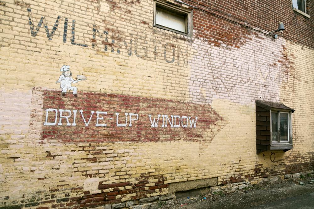 "Neglected brick wall exterior, Wilmington, Illinois, USA. Route 66"