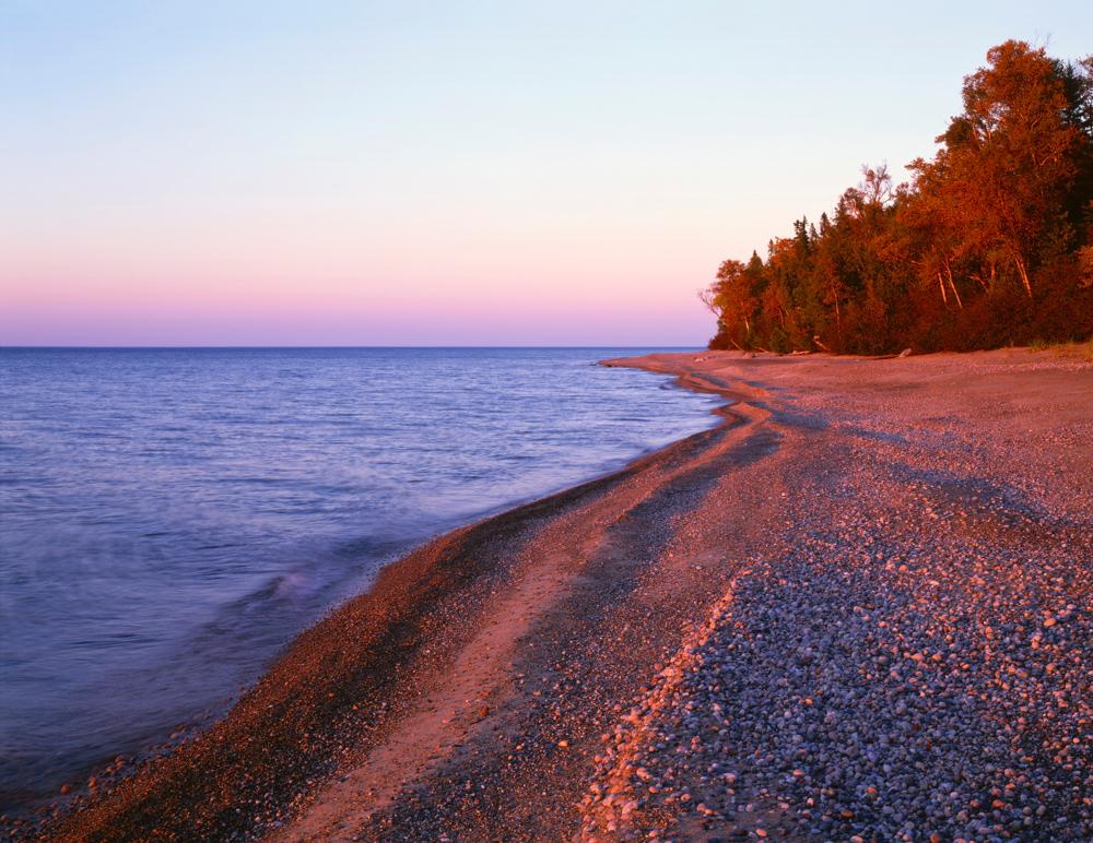 "USA, Michigan, Pictured Rocks National Lakeshore, Sunset warms rocky beach at shoreline of Lake Superior."