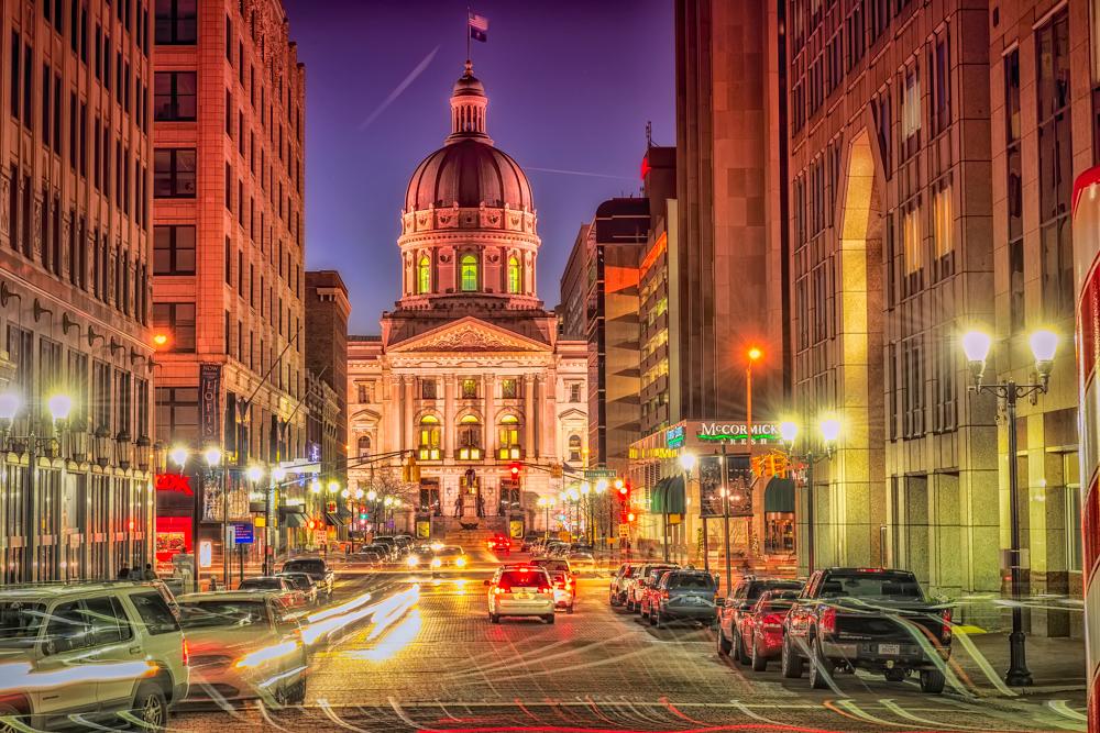 "USA, Indianapolis, Indiana. View of downtown buildings and lights during Christmas holiday season."