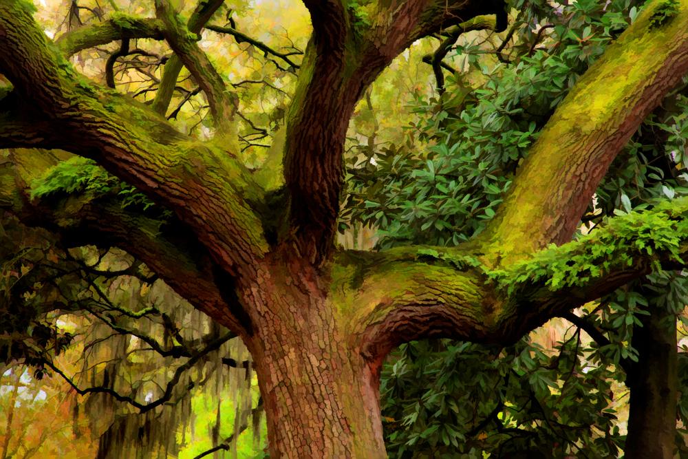 "North America, USA, Georgia, Savannah, Oak tree with Spanish moss and resurrection fern."
