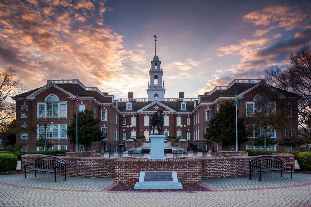 "USA, Delaware, Dover, Legislative Hall, Delaware State House, dusk"