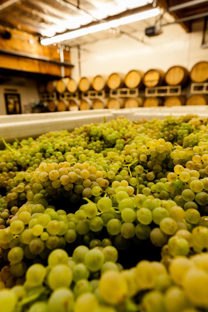 "Usa, Washington State, Woodinville. Bin of chardonnay grapes awaits crush."