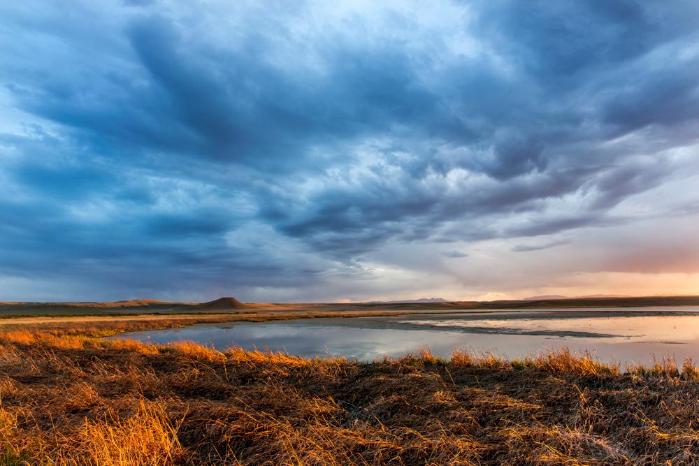 "Dramatic sunset light on pond at Freezeout Lake WMA near Fairfield, Montana, USA."