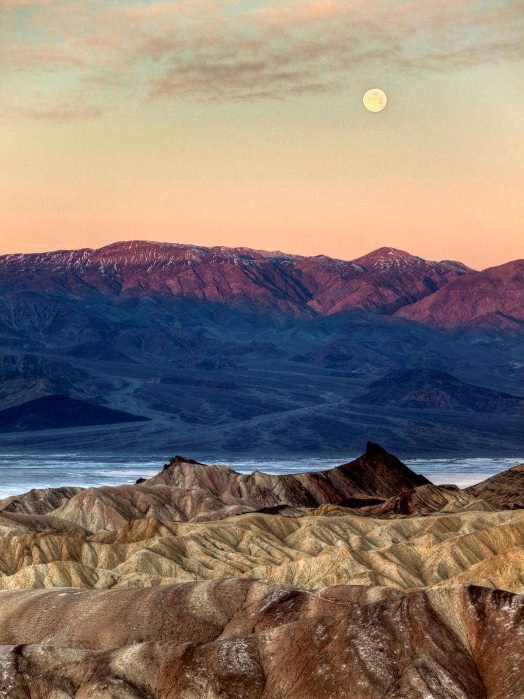 "USA, California, Death Valley National Park. Moonset at sunrise from Zabriskie Point"