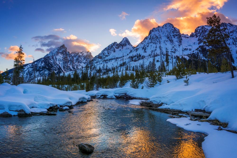 "Evening light over the Tetons from Cottonwood Creek in winter, Grand Teton National Park, Wyoming, USA"